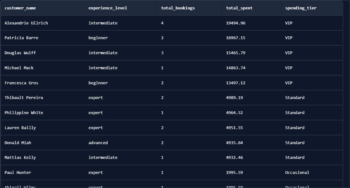 Hey Reader, Imagine you're a marketing analyst and your marketing director walks over and says: "I need our customers broken into spending tiers (VIP, Standard, and Low Value) so I can send different emails to each group." You have the data. But every customer just has a dollar amount. There's no "tier" column in the database. How do you create categories that don't exist yet? This is where CASE WHEN becomes one of the most useful tools in your SQL toolkit. The problem is that raw data doesn't come pre-labeled. Your database stores numbers: total spent, number of bookings, days since last purchase. But your marketing team needs categories: "VIP," "At-Risk," "New Customer." How to Create Categories That Don't Exist YetHere's what I ran against the Summit Adventures database (the fake adventure tourism company I created to help people learn business analytics):