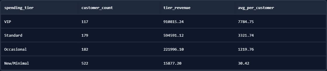 This gives you a summary table showing how many customers are in each tier, total revenue per tier, and average spend. That's the kind of breakdown your marketing director can act on immediately. Nice job! The Pattern to Remember