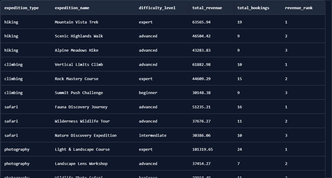Translating this for the CMO at Summit AdventuresPhotography's top performer (Light & Landscape Course) generates the most revenue of any single expedition ($101K from 24 bookings). Cultural expeditions dominate with beginner-friendly trips, while hiking's top performer (Mountain Vista Trek) has the highest booking volume (19 bookings) in the hiking category. This tells marketing exactly where to focus promotion dollars within each category. For example: invest heavily in the Light & Landscape photography course (proven revenue leader), expand beginner cultural offerings (Heritage Discovery Walk generates $83K), and promote the Mountain Vista Trek for volume-based campaigns. Breaking Down The Window FunctionLines 18-22: The Window Function Magic
