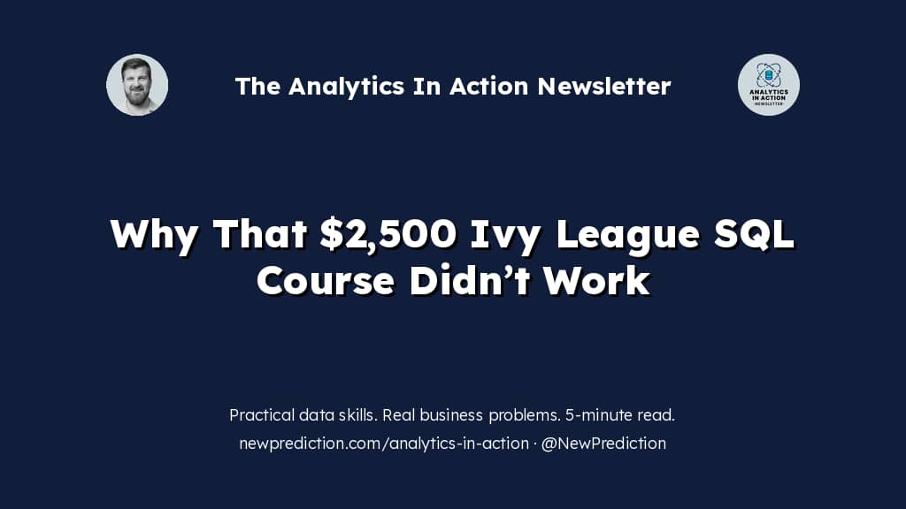 Hey Reader, Last week I showed you The Mister Rogers Blueprint, the step-by-step guide to approaching unfamiliar dataset and delivering actionable insights. You might be thinking: “Okay, cool framework. But does this actually work?” Fair question. Let me show you what happens when people learn SQL this way. First, let’s talk about what doesn’t work. Jenn (a student and data coaching client of mine) paid $2,500 for an SQL course from an Ivy League university. She thought it would be robust,...